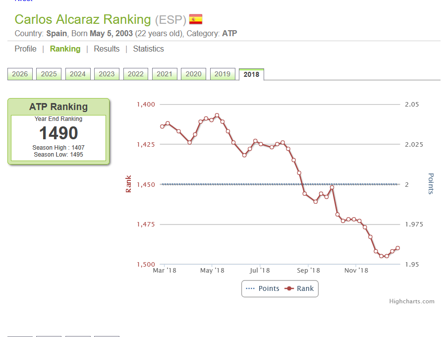 Alcaraz's ATP rankings records start from 2018 and show a season high of 1407. Not bad. Not what one might imagine to be anything major especially considering that he ended the year dropping off a cliff to 1495. Trawl through Alcaraz's match results and you'll find nuggets of gold in there too such as his loss to Holger Rune in straight sets in the quarter final of an under 14 tournament (2016). He would beat Rune in 2018. But even after that, there would be people like Rudolf Molleker who would win against him in 2019 but whose rankings remain stubbornly in the 100s to 400s.